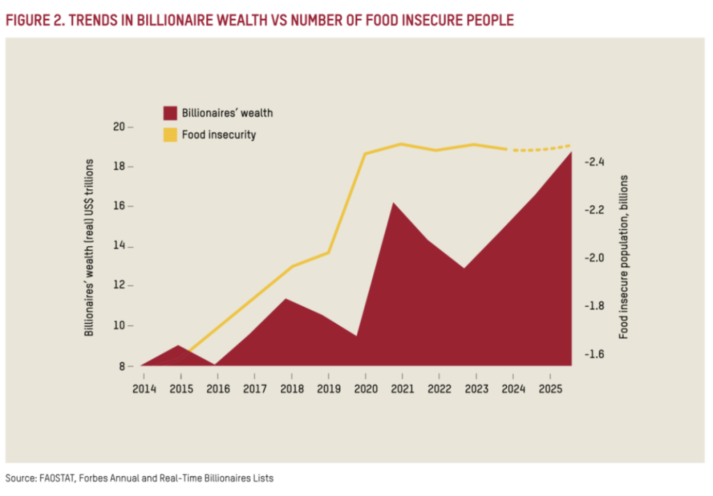 رپورٹ کے مطابق، اس وقت ارب پتیوں کی مجموعی دولت تاریخ کی بلند ترین سطح پر پہنچ چکی ہے۔ پہلی بار دنیا میں ارب پتیوں کی تعداد 3,000 سے تجاوز کر گئی ہے، جبکہ دوسری جانب دنیا کا ہر چوتھا انسان بھوک اور غذائی عدم تحفظ کا سامنا کر رہا ہے۔