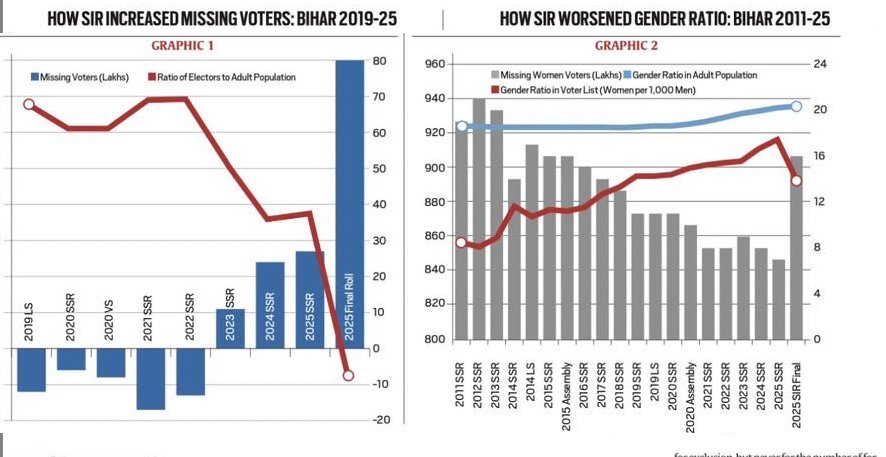 بہار کی ووٹر لسٹ میں خواتین کا تناسب آبادی میں ان کے حصے سے ہمیشہ کم رہا ہے۔ کئی سالوں میں، یہ فرق 2012 میں 21 لاکھ سے کم ہو کر اس سال جنوری میں صرف 7 لاکھ رہ گیا۔ SIR نے اس تاریخی رجحان کو پلٹ دیا ہے، خواتین کی حصہ داری کو کم کیا ہے، اور لاپتہ خواتین ووٹرز کی تعداد 16 لاکھ تک بڑھا دی ہے۔