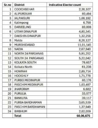 ریاست بھر کے جن 60 لاکھ ووٹرز کو اس زمرے میں رکھا گیا ہے، ان میں سے ایک بڑی تعداد مرشد آباد اور مالدہ جیسے اضلاع سے تعلق رکھتی ہے، جہاں تقریباً 20 لاکھ ووٹرز اس فہرست کی زد میں ہیں۔