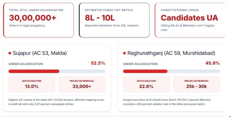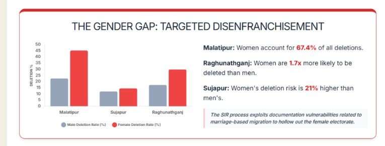 مغربی بنگال میں SIR کی سنگینی کو سمجھنے کے لیے ‘دی وائر’ (The Wire)Special Integrated Removal: Data Shows Large-Scale Deletion of Women and Minorities in West Bengal SIR کی ایک رپورٹ ملاحظہ کی جا سکتی ہے۔ رپورٹ کے مطابق، جب مالدہ اور مرشد آباد کے چند اہم حلقوں میں بوتھ لیول ڈیٹا دستی طور پر ڈاؤن لوڈ کر کے اس کی تصدیق کی گئی، تو حیران کن نتائج سامنے آئے۔ یہ وہ دو اضلاع ہیں جو اس ‘ایڈجوڈیکیشن’ کے تعطل کا سب سے زیادہ بوجھ اٹھا رہے ہیں۔