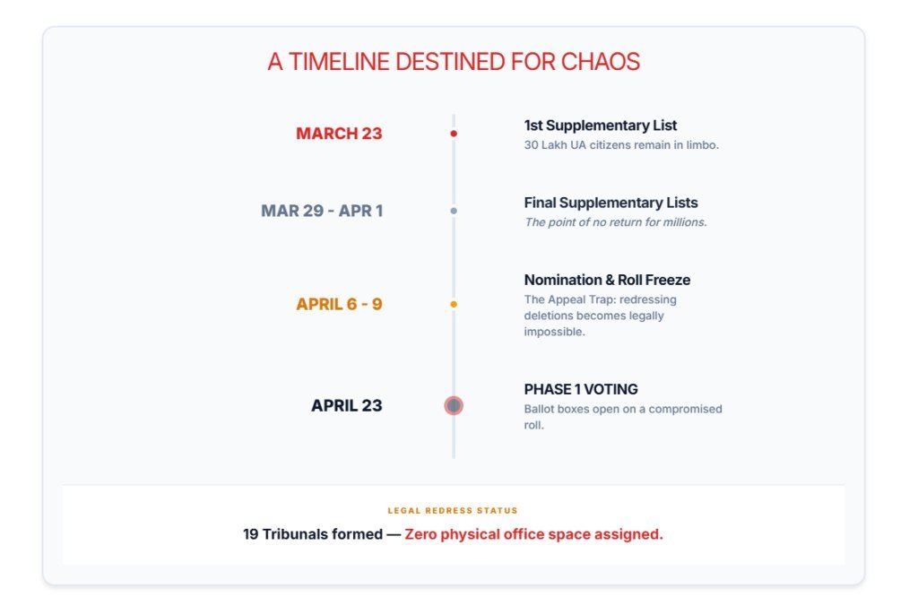 انتظامی تاخیریں اب الیکشن کیلنڈر سے ٹکرا گئی ہیں۔ الیکشن کمیشن پہلے مرحلے کے لیے 29 مارچ تک حتمی فہرستیں شائع کرنے کا پابند ہے، لیکن حل کے لیے وقت بہت کم ہے۔ نامزدگی کی آخری تاریخ (6 اور 9 اپریل) کے بعد فہرستیں منجمد ہو جائیں گی۔ 30 لاکھ کیسز حل کرنے کے لیے محض دو ہفتے باقی ہیں۔ اگرچہ 19 ٹریبونلز بنائے گئے ہیں، لیکن انہیں ابھی تک دفاتر الاٹ نہیں کیے گئے۔ عملی طور پر، بحالی کا قانونی راستہ وقت کی کمی کی وجہ سے بند ہوتا نظر آ رہا ہے۔